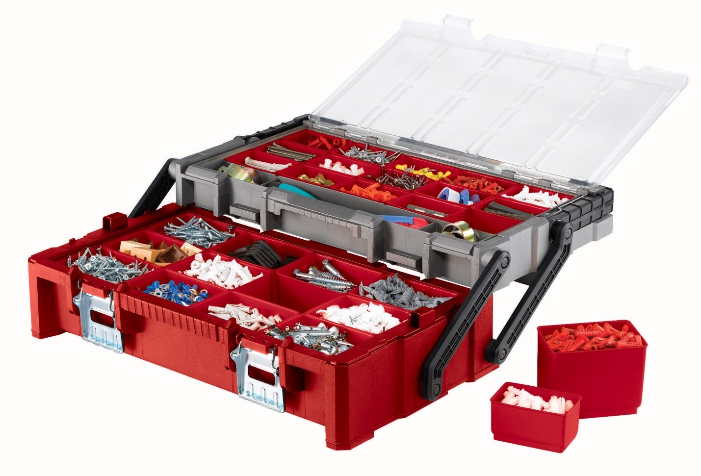 - Органайзер. Такие ящики редко бывают большими, так как предназначены для хранения разных мелких деталей, крепежа, насадок и тому подобного. Обычно отсеки можно переставлять, меняя размеры секций по своему усмотрению.