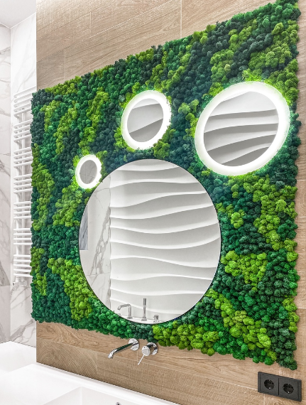 - Озеленение стабилизированным мхом: Создаёт уникальные текстуры и визуальные эффекты. Он неприхотлив в уходе, поэтому идеально подходит для людей с ограниченным временем.