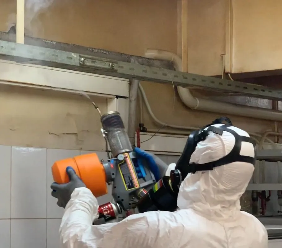 - Обработка холодным туманом — специалист в защитной экипировке распыляет инсектицид;