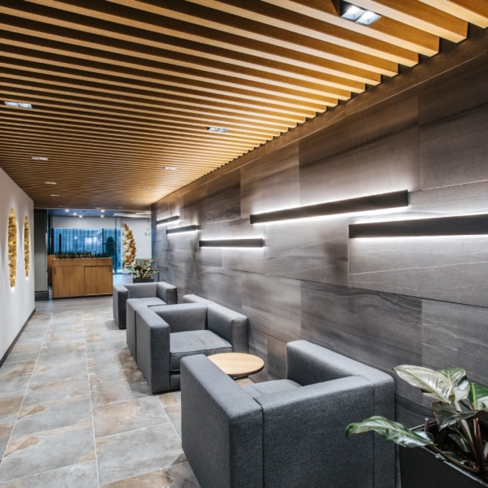 Реечные потолки занимают особую нишу. Алюминиевые планки различной ширины создают динамичную поверхность, которая работает в помещениях с повышенной влажностью.