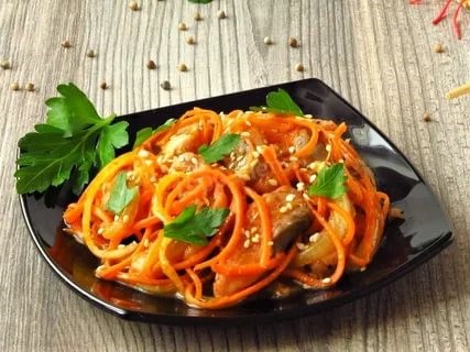 Рыбное филе необходимо нарезать на тонкие ломтики, примерно толщиной в 0.5 см. Далее выложить слой из рыбы, сверху засыпать кольцами лука. Добавить перец чили, соевый соус и уксус, после отправить в холодильник на 1 час. Тем временем натереть морковь, перемешать со специями и прожарить на раскалённой сковороде в течение 2-х минут. После того, как морковь остыла, добавить рыбу вместе с соком, перемешать. В таком виде блюдо должно промариноваться еще три часа.